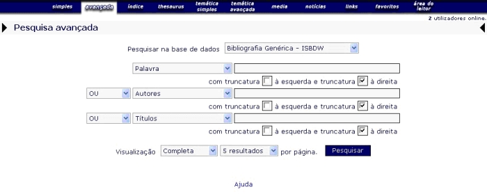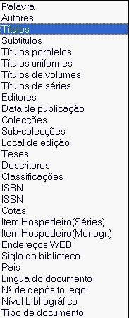 Podem combinar-se dois ou mais termos de pesquisa numa expressão, usando operadores de pesquisa, que indicam a relação a estabelecer entre os mesmos termos de pesquisa, e que serão indicados nas caixas correspondentes.A pesquisa poderá ser efectuada por uma palavra ou seleccionando o campo a partir da lista exibida aqui: