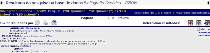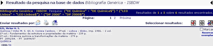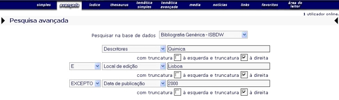 A expressão de pesquisa no Exemplo 4 irá encontrar todos os registos que contenham o Descritor (DE) QUÍMICA, "E" cujo Local de Edição (LED), Lisboa, "EXCEPTO" os que tenham como Data de Publicação o ano 2000.