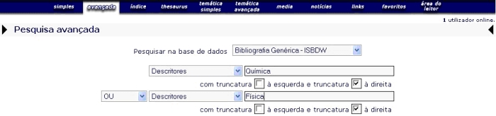 A expressão de pesquisa no Exemplo 1 irá encontrar todos os registos que contendo descritores (DE) QUÍMICA ou FÍSICA, enquanto que no Exemplo 2 encontrará todos os registos contendo descritores (DE) QUÍMICA e FÍSICA.