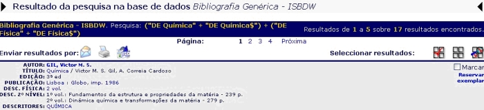 Enquanto que a expressão de pesquisa no Exemplo 1 irá encontrar todos os registos que contenham os Descritores (DE) QUÍMICA ou FÍSICA, no Exemplo 2 esta devolverá, como resultado, apenas os registos que contenham simultaneamente o Descritor (DE) QUÍMICA e FÍSICA. Enquanto que, no Exemplo 1, obtivemos como resultado 17 registos com o Descritor Química, no Exemplo 2 apenas apurámos 1 registo reunindo as duas premissas.