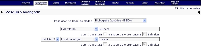A expressão de pesquisa no Exemplo 3 irá encontrar todos os registos que contenham o Descritor (DE) QUÍMICA exceptuando os que tenham como Local de Edição (LED) Lisboa.
